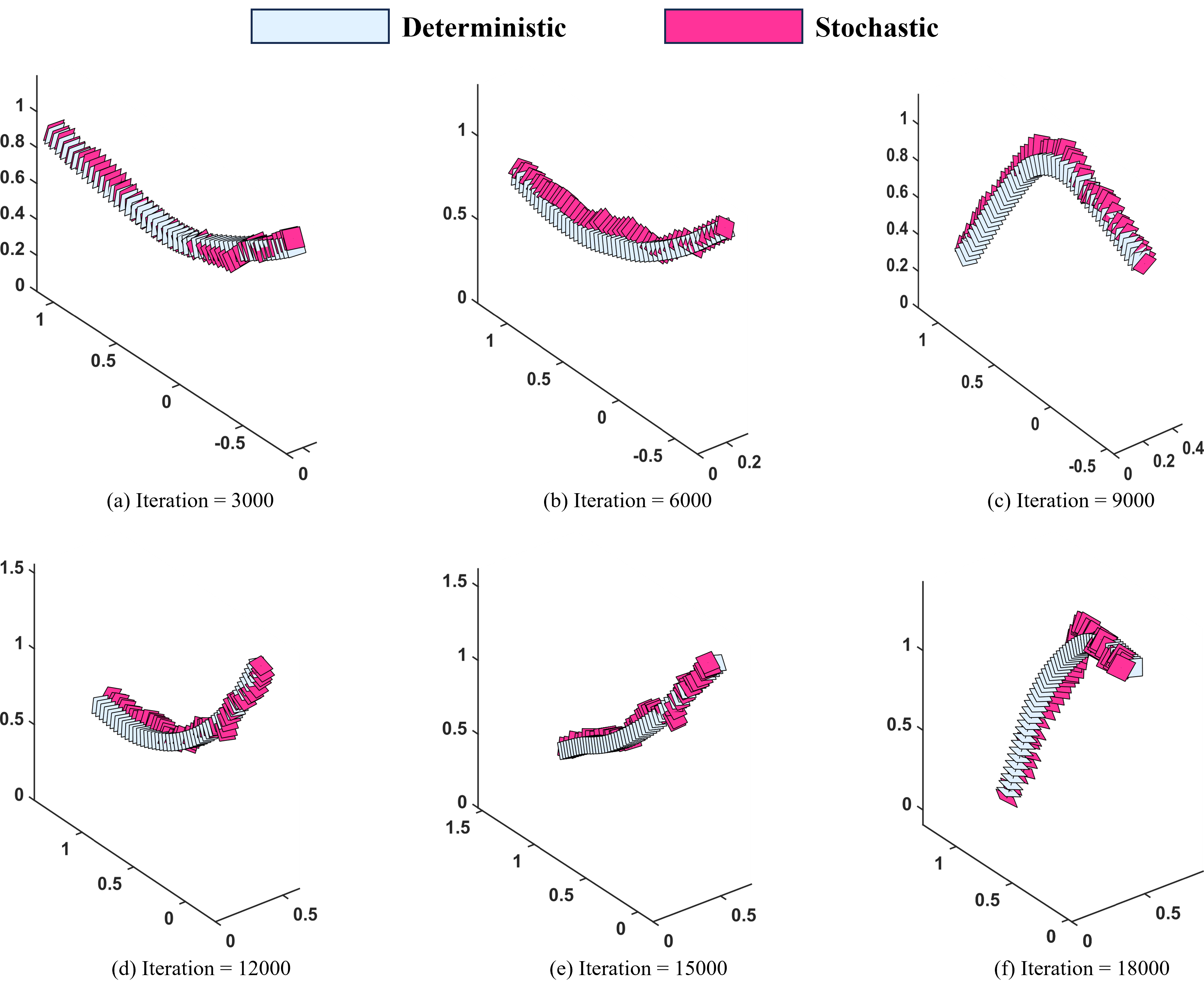 Geometrically exact beams naturally arise in physical phenomena and engineering practice for modeling flexible structures, such as soft robotic manipulators and DNA structures. To the best of our knowledge, there appear to be no geometric integrators for the stochastic geometrically exact beam in a stochastic variational formulation. In this paper, we introduce variational principles for the dynamics of the stochastic geometrically exact beam, in both continuous- and discrete-time settings. By introducing stochastic perturbations from two variational viewpoints, we derive the stochastic differential equations of motion under the framework of Hamel's formalism. The resulting two structure-preserving stochastic geometric integrators simultaneously discretize time and space in a parallel manner, which provides a distributed computational approach to solve the stochastic dynamics of the beam system. In particular, the proposed integrators are shown to be stochastic extensions of the well-known deterministic staggered leapfrog scheme for the wave equation, and also stochastic extensions of Yee's scheme for spatially one-dimensional computational electromagnetism. Numerical results are shown to demonstrate the effectiveness of the proposed approaches.